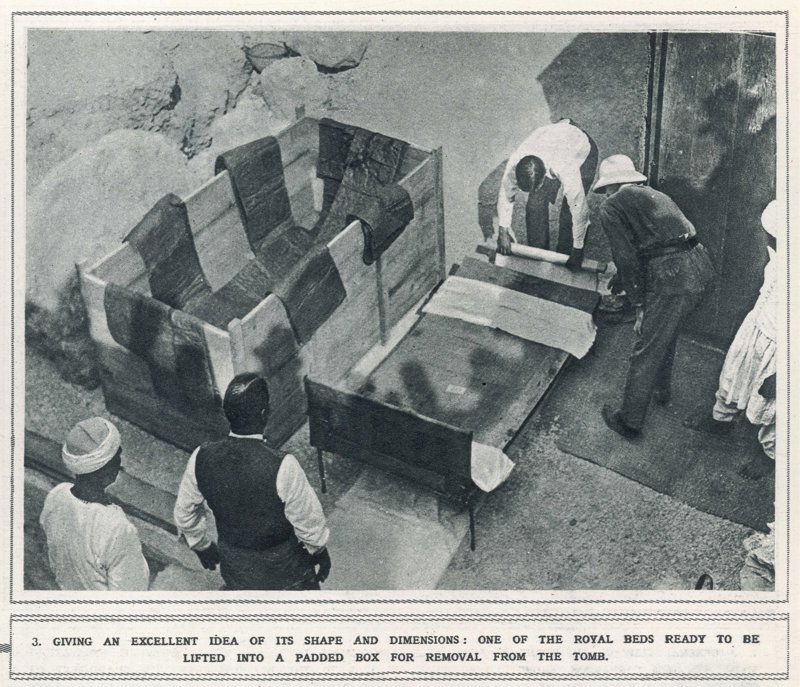 Gran parte del trabajo de análisis y catalogación de las piezas se realizaba en el interior de las cámaras donde se iba encontrando. En este caso, se puede ver a las dos estatuas a tamaño real de los guardianes de la tumba del faraón. Una de ellas todavía en su ubicación original, a un lado de la puerta de la cámara funeraria, y la otra siendo cuidadosamente preparada para su extracción y traslado. De pie, junto a Howard Carter, se cree que estaba Lord Carnarvon. El aristócrata inglés había vendido la exclusiva del descubrimiento al periódico londinense The Times. Además de los lucrativos beneficios que el diario le pagaba por la venta de los textos y fotos a terceros, así el equipo evitaba la tediosa tarea de atender a los medios para explicar todos y cada uno de los detalles de la excavación.