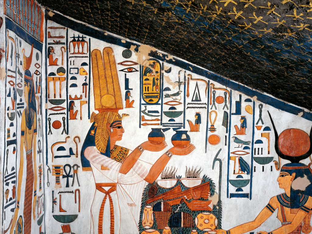 La función real se «encarnaba» en el soberano en la coronación: cuando la doble corona del Bajo y el Alto Egipto se colocaba sobre la cabeza del nuevo faraón, este se convertía inmediatamente en un dios en la tierra. El soberano así coronado daba nueva vida al mundo iluminando el cosmos como el Sol. La función de la realeza era una especie de cadena infinita, ininterrumpida desde el principio de los tiempos, en la que cada faraón constituía un eslabón y se conectaba directamente con los dioses primordiales.