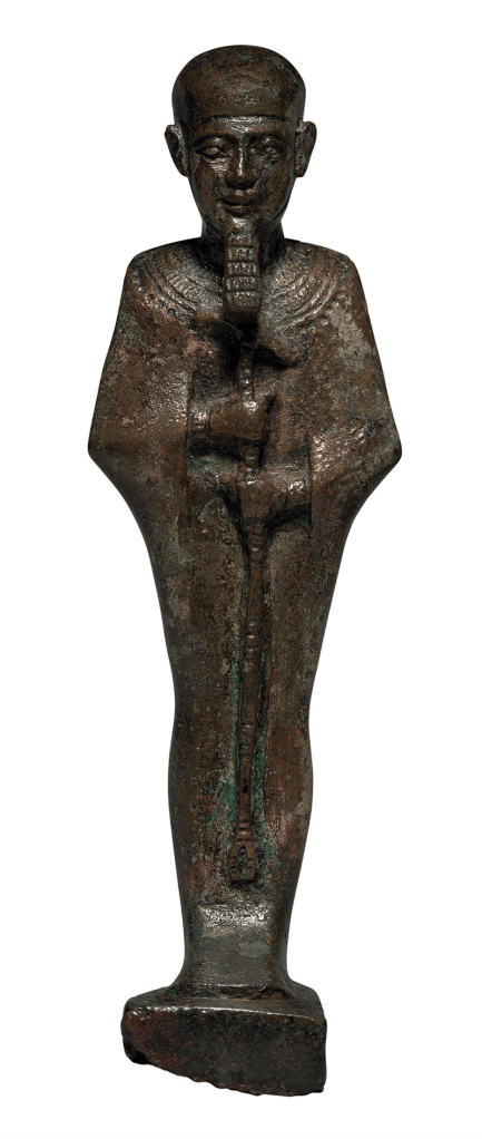 El faraón vestía un manto ceñido que le daba una forma parecida a la de una crisálida, quizá para acercar su figura a la idea de regeneración espiritual y física.