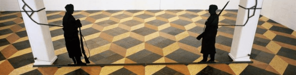 La exposición recibe al visitante con una pieza que se ha visto poco, Dos centinelas sobre suelo óptico (1990), de la Colección Meana Larrucea.