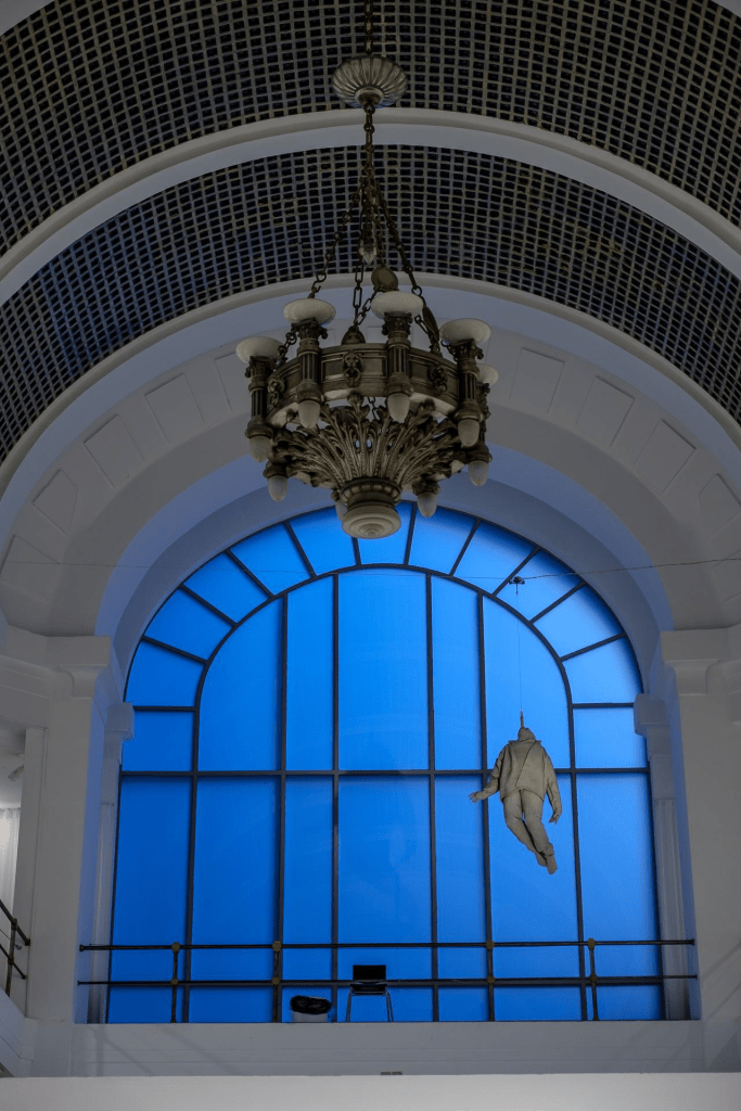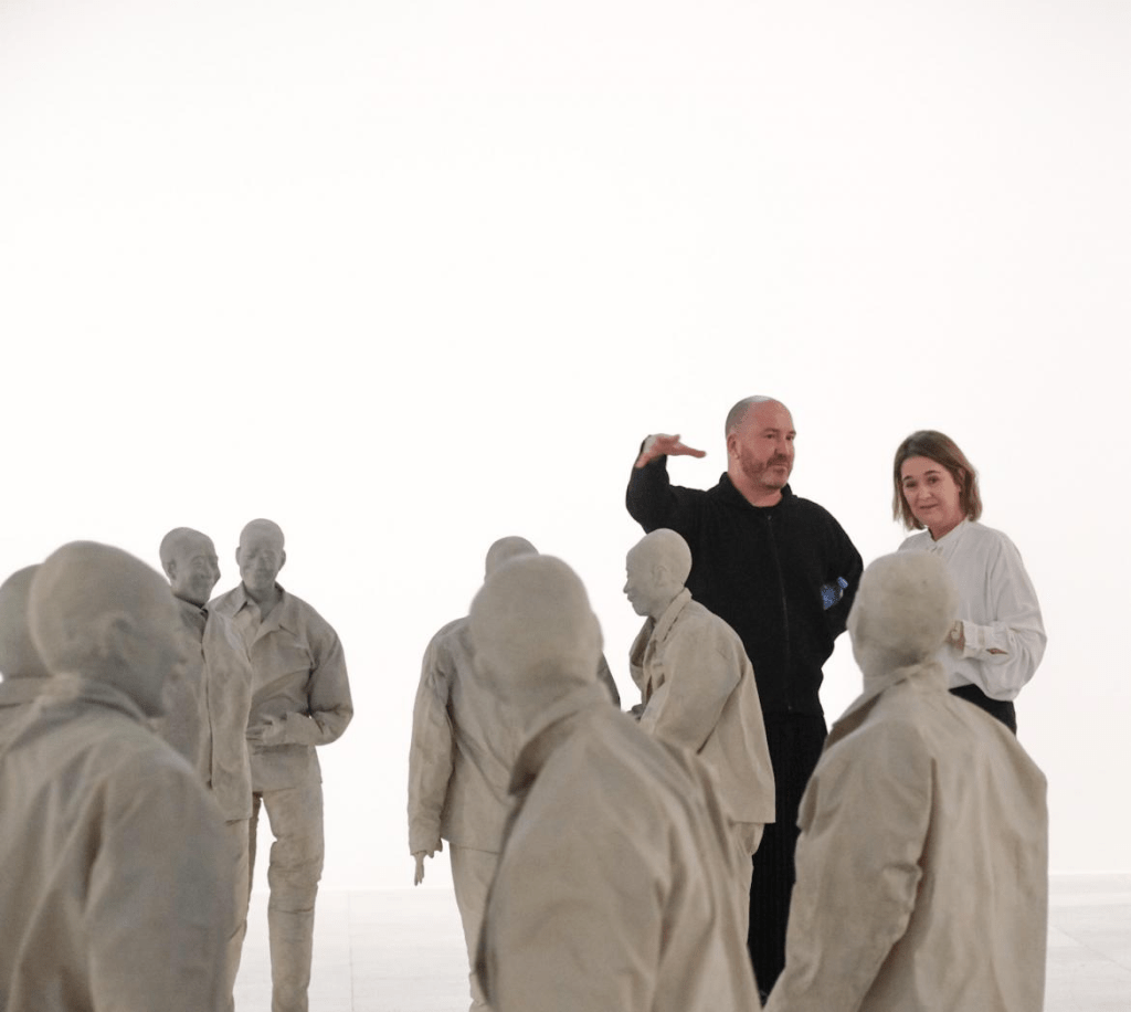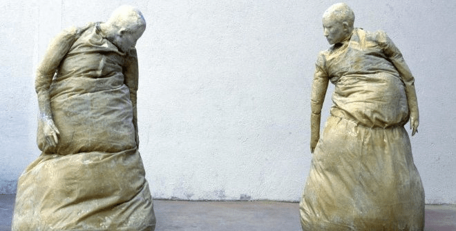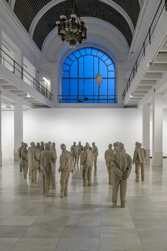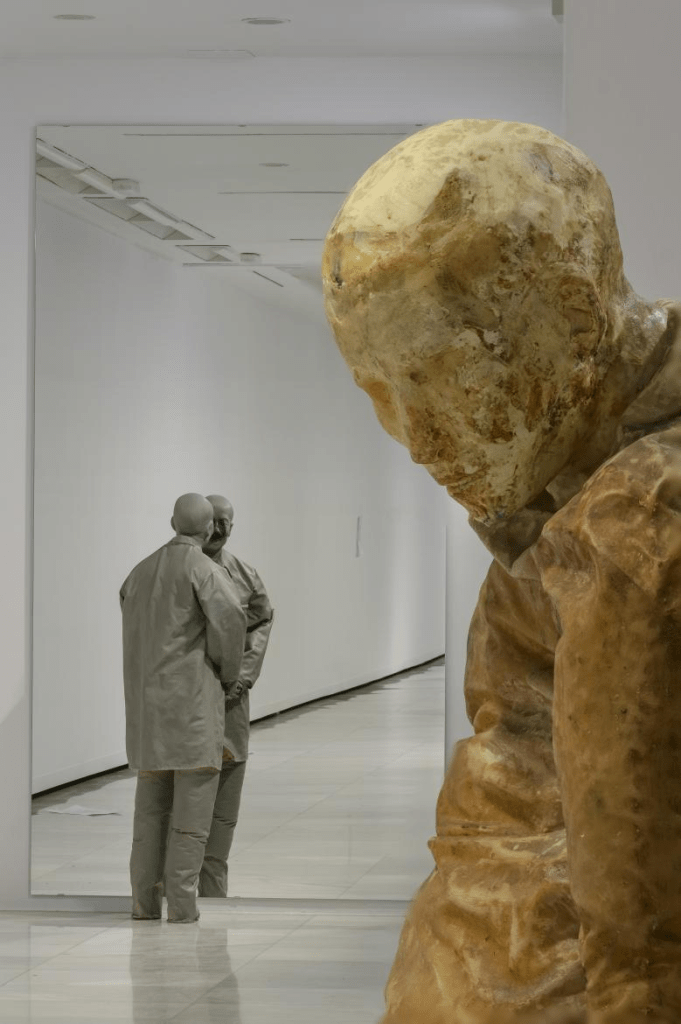El universo de Juan Muñoz está poblado de tentetiesos vigilantes, tambores silenciados, personajes enrollados en alfombras orientales (no sabemos si quieren esconderse o están atrapados), balcones interiores a los que nadie puede asomarse, columnas torsionadas de terracota creadas para una casa de Mies van der Rohe, personajes metamorfoseados en persianas o sentados en sillas colgadas de la pared y a punto de caerse, vitrinas que semejan gabinetes de curiosidades decimonónicos que encierran objetos para el baño, pero también fetiches para el placer… Sus figuras de resina son de una escala un 20% menor que la real. Juan era daltónico, de ahí que el color de las mismas sea grisáceo.