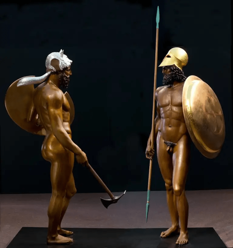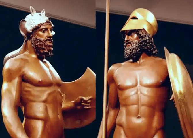 Los Bronces en origen eran cinco y no dos, y tienen un origen mitológico: formaban parte de un grupo estatuario que representaba el momento inmediatamente anterior al duelo fratricida entre Eteocles y Polinices, hermanos de Antígona, del mito de los ‘Siete contra Tebas’ relacionado con el de Edipo. A y B son Polinices y Eteocles, que se retan a duelo por el trono de Tebas.