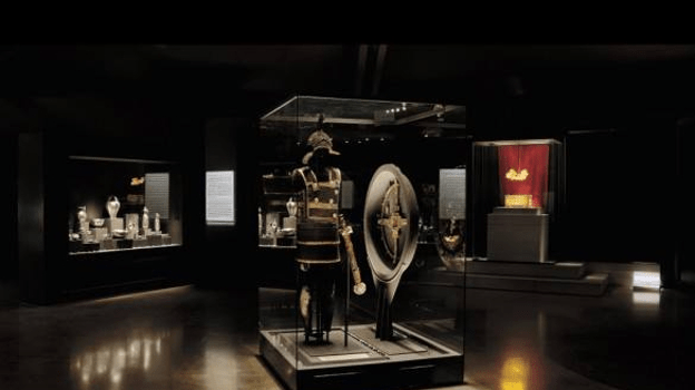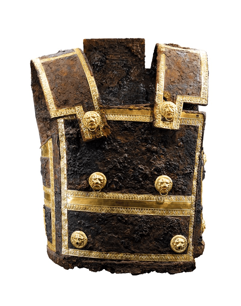 La coraza hallada en la tumba de Filipo II tras su restauración. Estaba articulada en ocho puntos, rematada con cuero y tela y se adornaba con pequeñas cabezas de leones de oro.