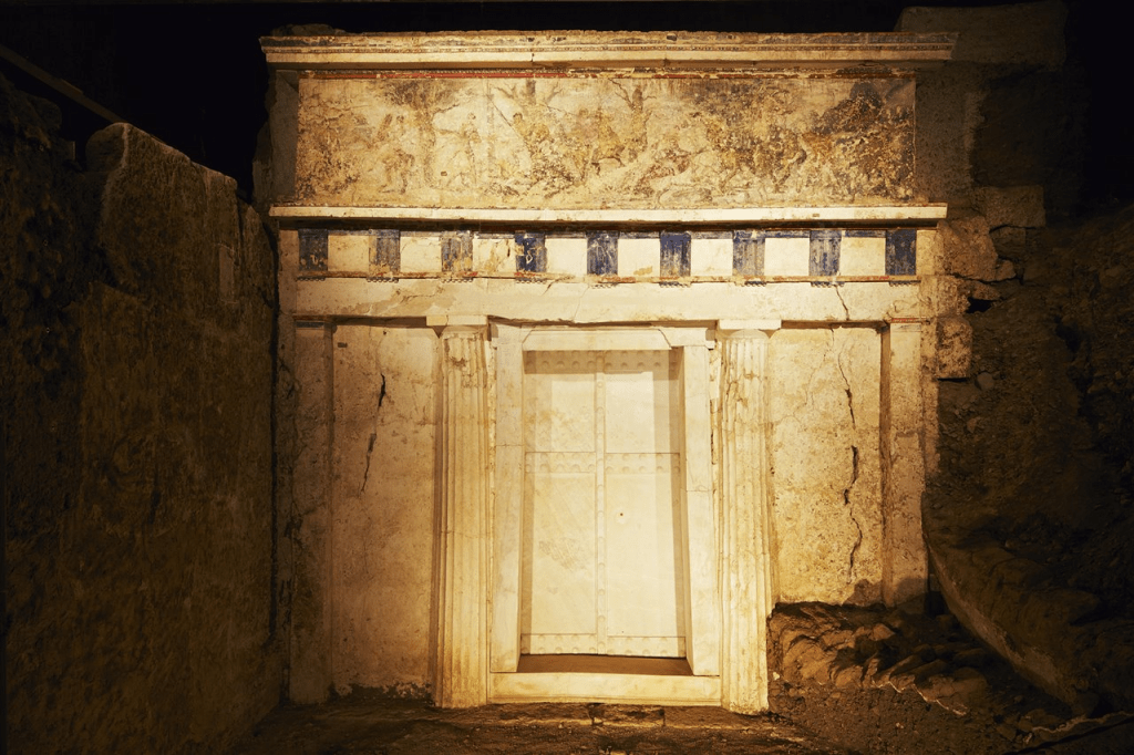 En 1977, el arqueólogo Manolis Andronikos hizo un descubrimiento sensacional en la necrópolis real de Vergina: la tumba intacta de Filipo de Macedonia, magníficamente decorada con pinturas murales y un sarcófago de mármol dentro del cual se había depositado una urna funeraria de oro que contenía unos restos incinerados acompañados de armas, una diadema de oro y objetos de gran calidad.