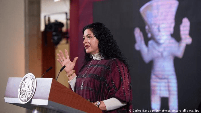 Alejandra Frausto, secretaria de Cultura del Gobierno de México durante la ceremonia de recibo oficial de las obras prehispánicas mexicanas
