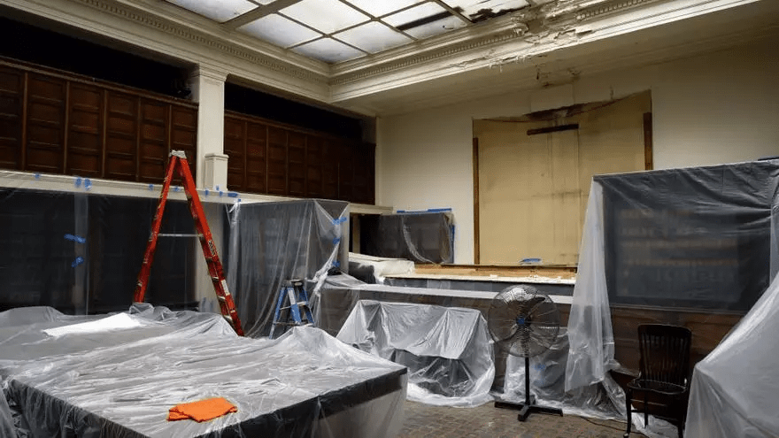 Aspecto de la sala de lecturas de la biblioteca donded se aprecian los efectos de las goteras