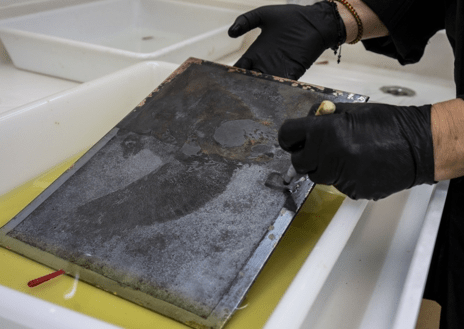 Previo al tratamiento de desacerado, se realiza una eliminación de elementos depositados en las superficies como barnices protectores, Paraloid y tintas antiguas cristalizadas. Una vez eliminadas las capas electrolíticas se realiza un tratamiento de inhibición del cobre y la protección de las planchas con un barniz reversible y estable.