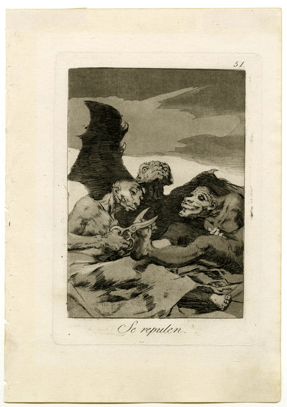 Las siguientes series llegaron a la Calcografía bastantes años después, ya que no fue hasta 1862 cuando la Academia adquirió las ochenta láminas de los Desastres de la guerra -cuatro de ellas grabadas al dorso de dos paisajes- y dieciocho de los Disparates, que habían quedado en la Quinta del Sordo a la salida de Goya hacia Francia.