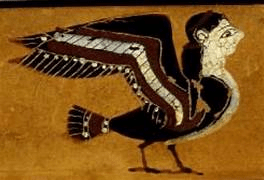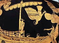 Odiseo sigue el consejo de Circe para poder disfrutar de la dulcísima voz de las sirenas sin riesgo: a él lo amarran al mástil y sus hombres se tapan los oídos con cera. Homero no las describe, pero conservamos cerámicas que reproduce esta escena de la Odisea y las representa como mitad mujer, mitad ave.