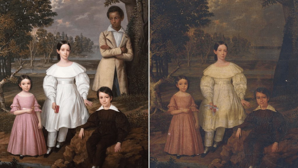El cuadro de un paisaje con tres menores blancos (dos niñas y un varón) guardó un secreto debajo de lo que parecía un trozo del horizonte. Una restauración desveló que detrás de esa mancha había un adolescente negro. El Metropolitan Museum neoyorquino, que lo ha adquirido, lo exhibirá a partir de otoño, sin que se hayan desvelado todas las incógnitas que rodean este caso.