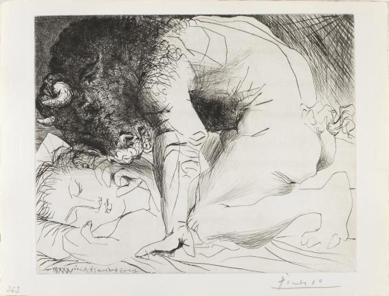 Un Delacroix del que se expone El duque de Orleans mostrando a su amante, en la que literalmente levanta la sábana que la cubre en la cama, igual que hace Fauno descubriendo a una mujer, parte de la Suite Vollard de Picasso.