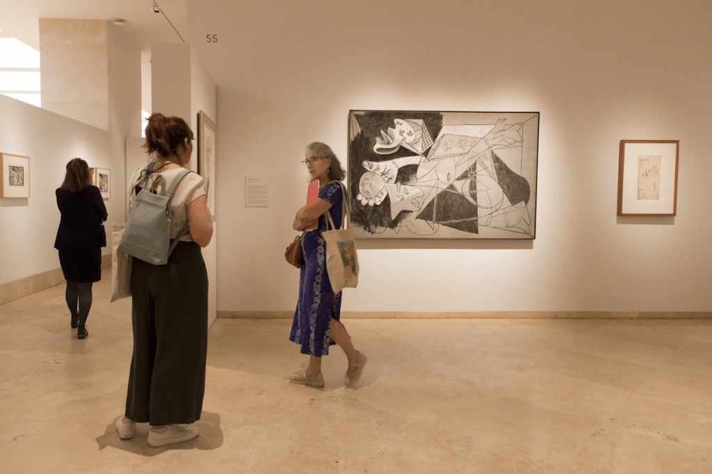 “Podemos ver el Gernika como un gran paso de Semana Santa que avanza de derecha a izquierda”, osa decir -ella misma utiliza este verbo- Paloma Alarcó, conservadora de pintura moderna del Museo Thyssen de Madrid y comisaria de su nueva exposición, Picasso, lo sagrado y lo profano, que estará abierta hasta el 14 de enero.