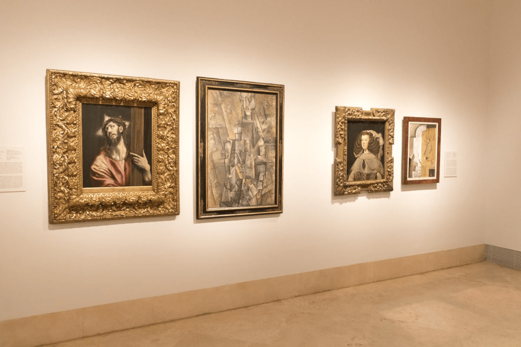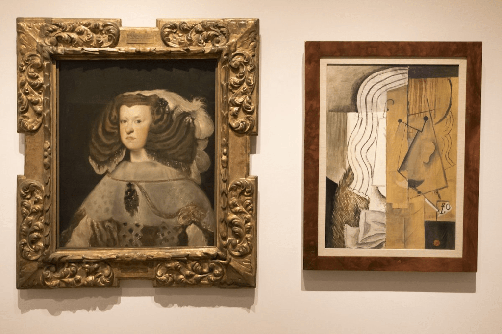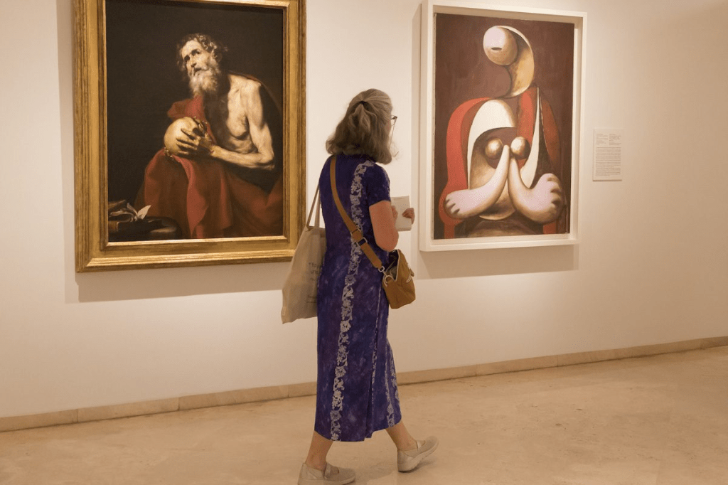 La muestra arranca enfrentando un Cristo del Greco a un cuadro del cubismo analítico de Picasso, Hombre con clarinete, mostrando la verticalidad que impera en ambos. “Picasso llegó a decir que el Greco había sido el primer pintor cubista”, recuerda Alarcó. Una santa Casilda de Zurbarán se contrapone a una Mujer en sillón de Picasso, y la comisaria contrasta además un san Jerónimo “tenebrista de Ribera con un cuadro que Picasso pinta en el momento en que ha roto matrimonio con Olga. La pinta de manera tétrica, hay un diálogo fantástico”. “Picasso va evolucionando y en cada momento se fija en un artista, pero nunca los abandona, tiene una libertad creativa que los absorbe, desbarata y transforma en su propia sintaxis”, asegura.