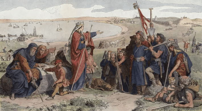 Esta imagen de la Historia ilustrada de Dinamarca de 1864 muestra a la reina vikinga Thyra ordenando la construcción de Danevirke, un sistema de fortificaciones en la península de Jutlandia, donde se asienta la actual Dinamarca.FOTOGRAFÍA DE LOOK AND LEARN, BRIDGEMAN IMAGES