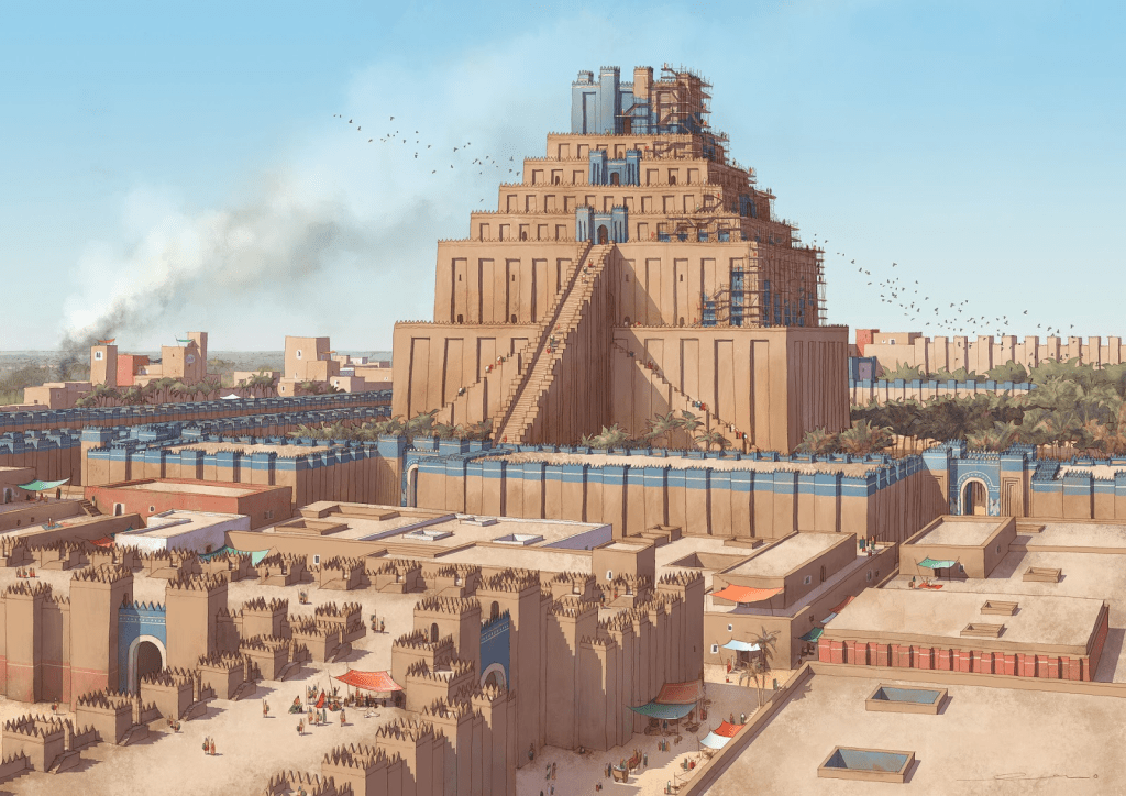 En la historia del Génesis, el pueblo espera hacerse conocido para ser recordado después de la muerte y por ello comienza a construir una gran torre para alcanzar los cielos. Dios se enfada por ello, ya que le preocupa que, si se permite que el pueblo alcance su objetivo, se vea capacitado para atentar contra los demás y alterar así el orden natural. Por lo tanto, decreta que se confundan sus lenguas y, como ya no pueden entenderse, la torre queda sin terminar. Samuel Noah Kramer explica la historia como un intento de explicar los numerosos zigurats, incluido el de Babilonia, encontrados en ruinas y vistos por los escribas hebreos o descritos a ellos (Sumerios, 293-294).