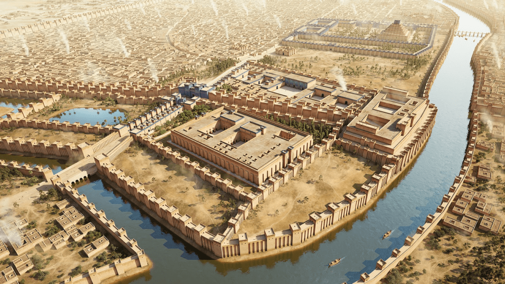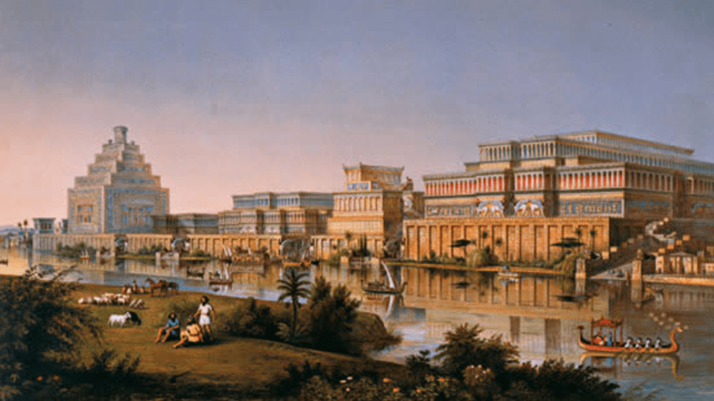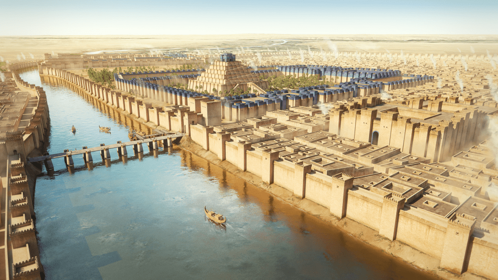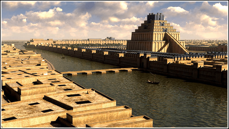 Es la ciudad más famosa de la antigua Mesopotamia, cuyas ruinas se encuentran en el actual Irak, a 94 km al suroeste de Bagdad. Su nombre deriva de bav-il o bav-ilim, que en acadio significaba Puerta de Dios (o Puerta de los Dioses); Babilonia en griego. En su época, es un gran centro cultural y religioso.