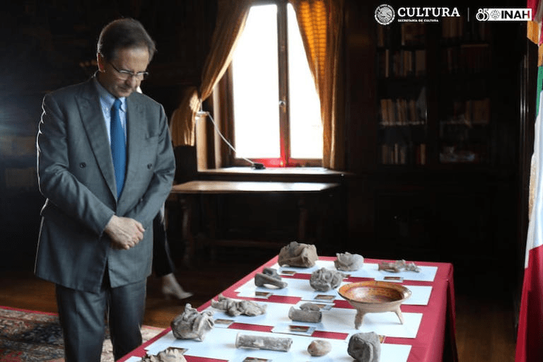 El embajador Esteban Moctezuma Barragán, junto a las piezas que van a ser repatriadas en los próximos días© INAH