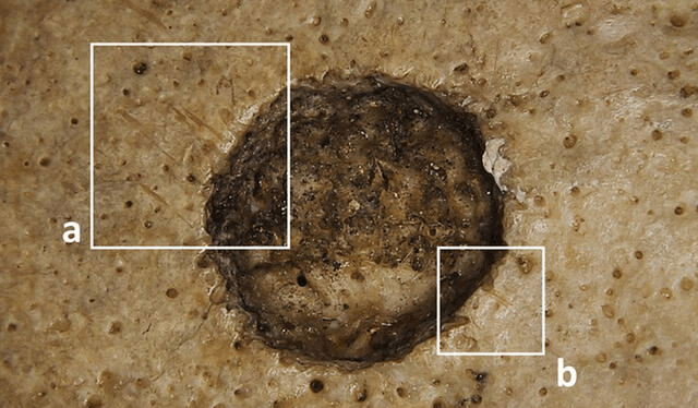 Lo que sorprendió a los investigadores fue el descubrimiento de marcas de corte alrededor de estas lesiones, que probablemente fueron hechas con un objeto punzante, como un instrumento metálico, con la posible intención de «curar» este tumor cerebral con metástasis.
