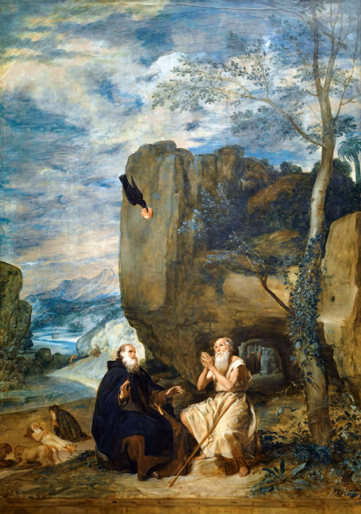 Este óleo de Diego Velázquez muestra a san Antonio Abad (a la derecha) en un encuentro legendario con san Pablo en el desierto de Egipto. Prado, Madrid.