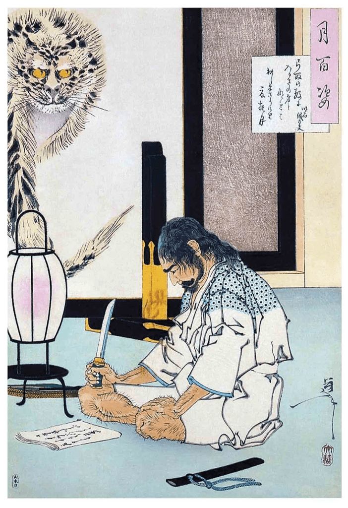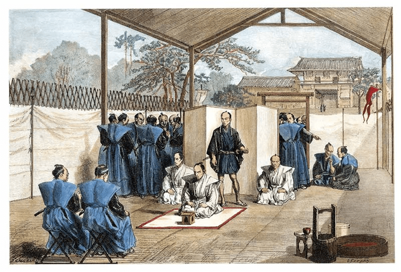 Un samurái se enfrenta al seppuku obligatorio con el colaborador que debe decapitarlo a su espalda. Foto: AKG / Album