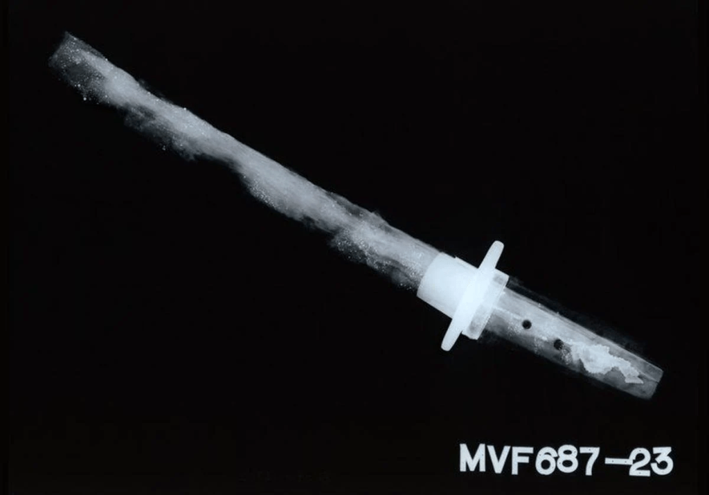 Radiografía del Wakizashi con los dos agujeros visibles en la espiga del mango para fijar el mango de madera Museos estatales de Berlín / Museo de Prehistoria e Historia Antigua / Anica Kelp