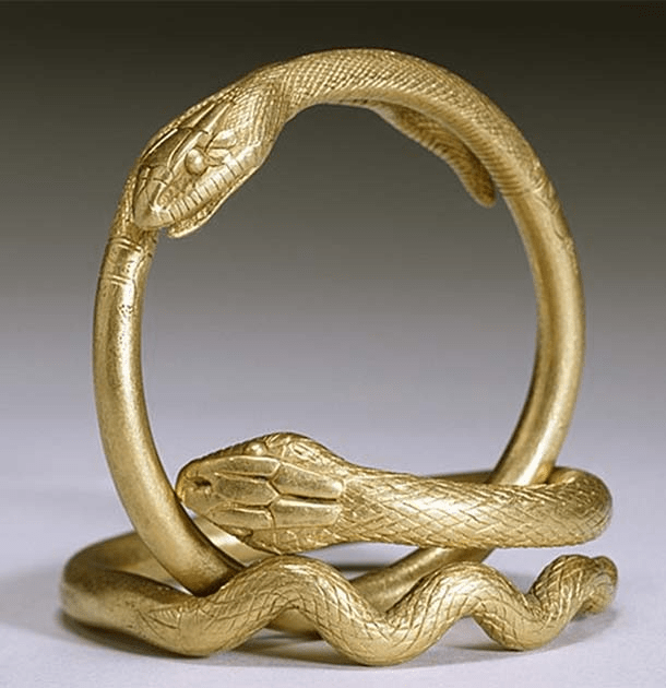 En el antiguo mundo romano, las pulseras como este diseño de serpiente se usaban a menudo en pares, tanto alrededor de las muñecas como en la parte superior de los brazos