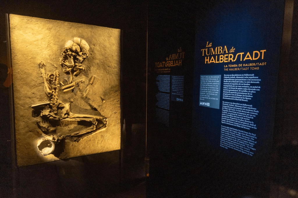 Destaca también un panel sobre la tumba de Halberstadt, hallada en 2019 en Sajonia-Anhalt (Alemania). Es el esqueleto de un varón que aparece junto a un vaso cerámico, un puñal de cobre y un brazal de piedra con motivos geométricos.