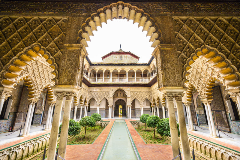 Reales Alcázares. Tras la conquista de Sevilla por Fernando III el Santo, este conjunto de edificios y patios se convirtió en alojamiento real. Arriba, palacio erigido por Pedro I en 1364. Foto: iStock