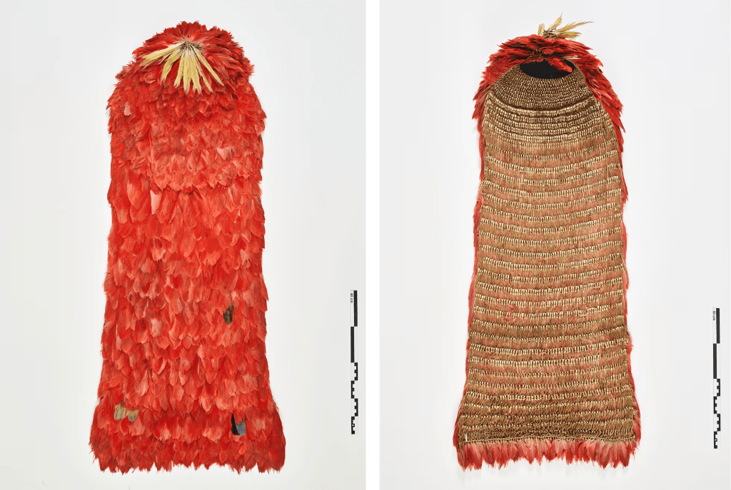 Para su confección se utilizaban más de 4.000 plumas de ibis escarlata, un ave marina que actualmente está extinta en toda la región. Las plumas son cosidas con la mejor técnica para formar una capa que mide 1,80 metros de largo, y que es utilizada por los chamanes o líderes indígenas, ocasionalmente en sacrificios de guerra.
