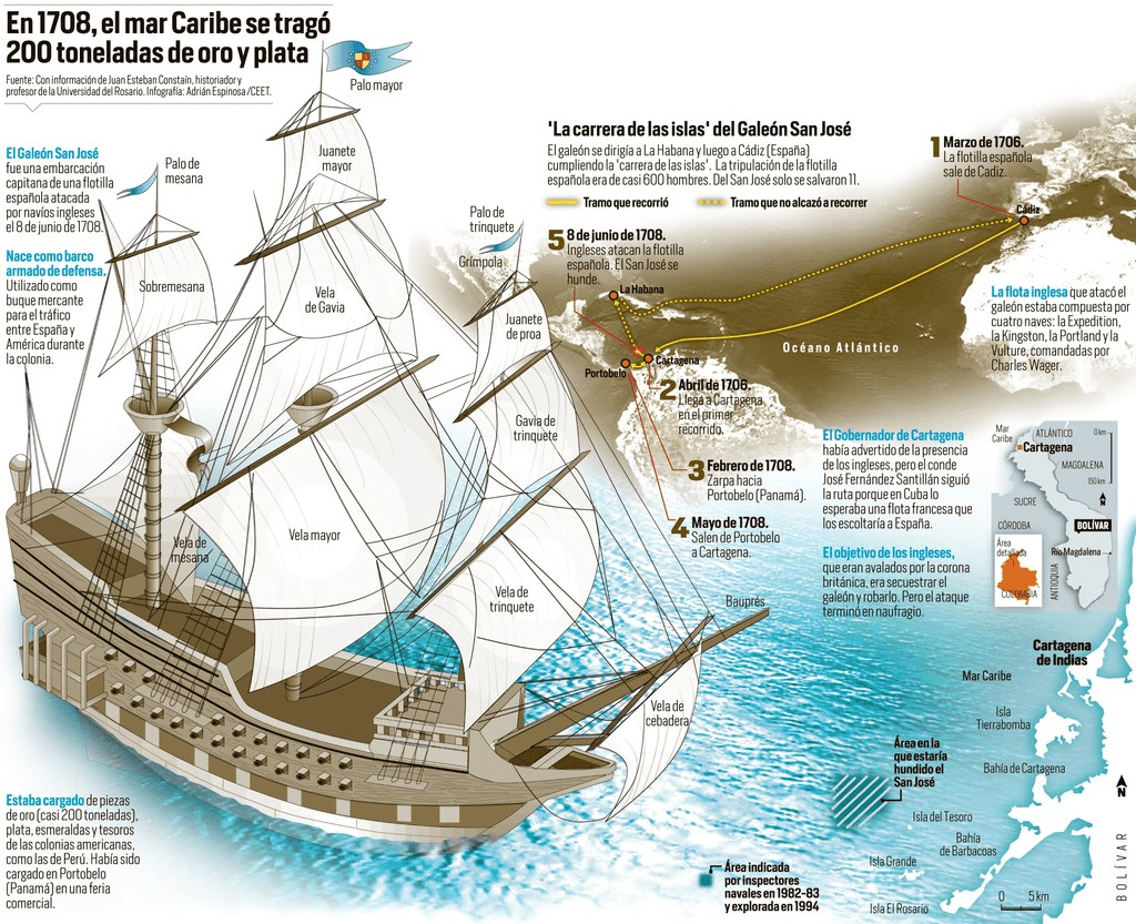 El San José, que pertenecía a la Armada española, fue hundido, según crónicas de la época, con cerca de 11 millones de monedas de ocho escudos en oro y plata que había recogido en la feria de Portobelo.