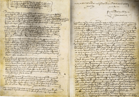 Página del Tratado de Tordesillas (7 junio 1494) entre los Reyes Católicos y Juan II de Portugal por el que se repartía la navegación y conquista del Océano Atlántico y el Nuevo Mundo mediante un meridiano situado a 370 leguas al oeste de las islas de Cabo Verde. Biblioteca Nacional de Lisboa.