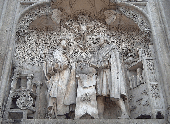 Cristóbal Colón exponiendo sus proyectos a Diego Deza. Detalle del Monumento a Colón en la Plaza de Colón (Madrid).