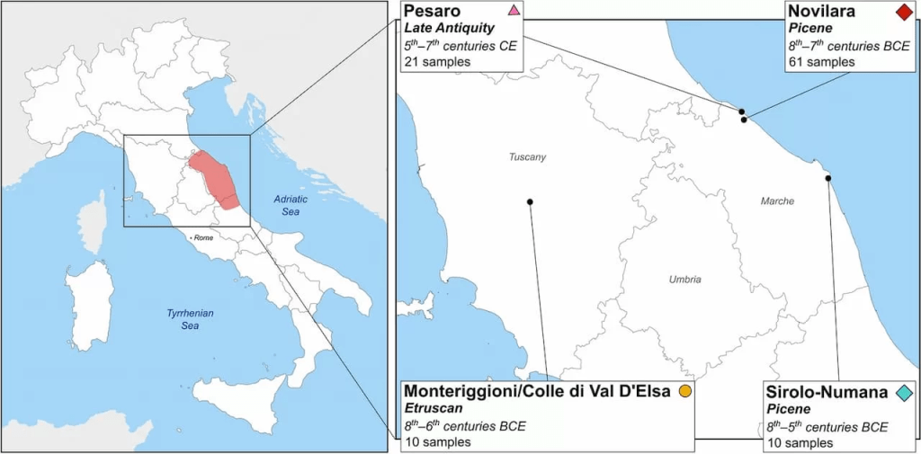 Localización de los yacimientos analizados en este estudio. A la izquierda, mapa de Italia con la zona de Picene resaltada en rojo. A la derecha, la ampliación de Italia Central mostrando la localización, el periodo y el número de muestras de cada necrópolis analizada en este estudio. Crédito: F. Ravasini et al.