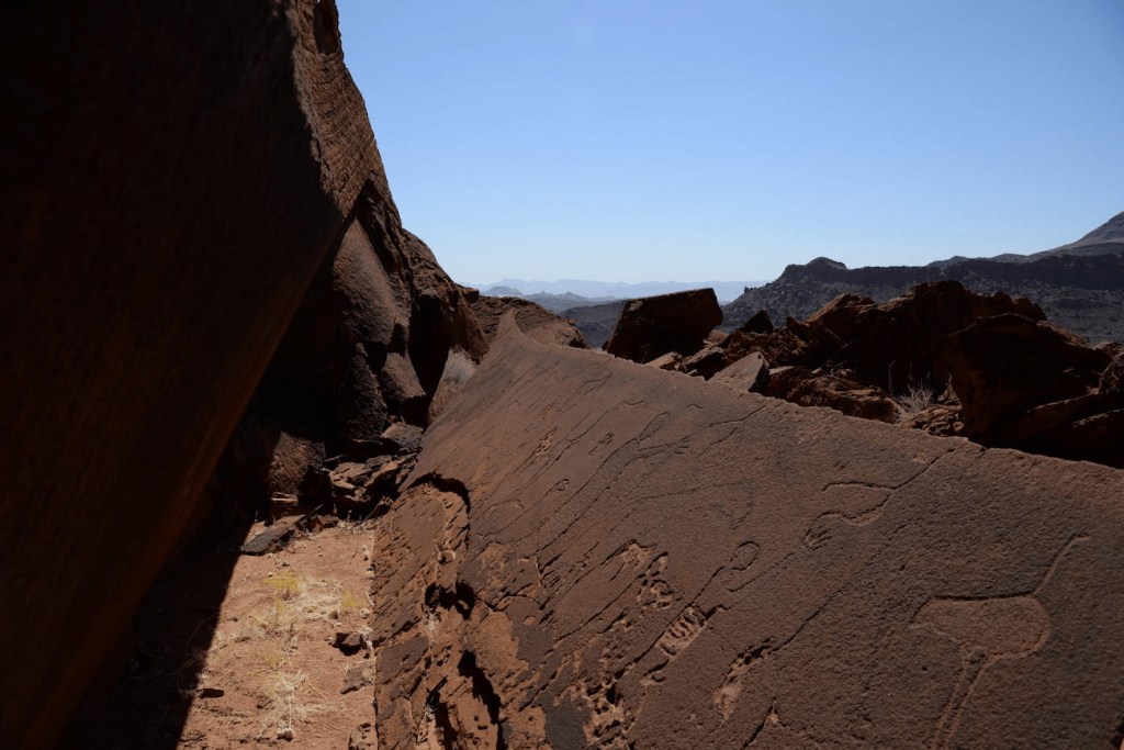 En el nuevo estudio, los investigadores contaron con la ayuda de expertos en rastreo indígenas del desierto del Kalahari para analizar las huellas de animales y humanos en el arte rupestre de las montañas Doro Nawas, en el centro de Namibia occidental.