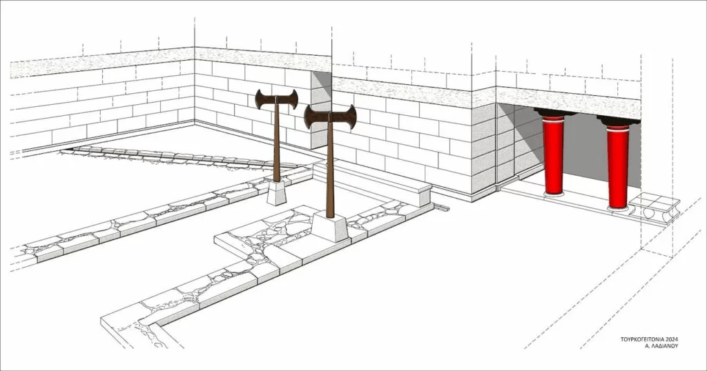 Dibujo de la entrada sur del palacio con dos bases para hachas dobles. Ministerio de Cultura de Grecia