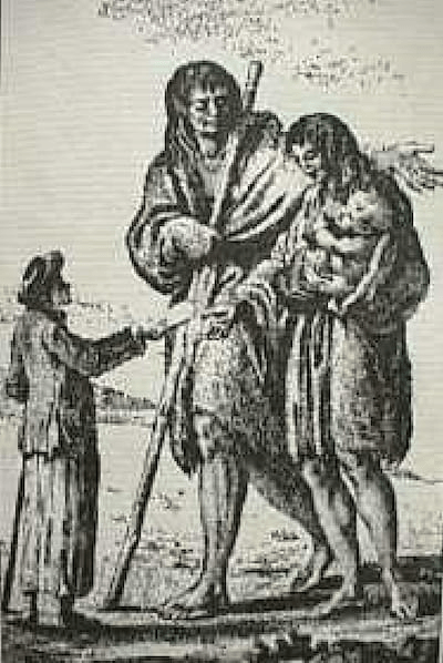 Un marinero ofrece pan a una pareja de patagones para su bebé. Grabado basado en una acuarela anónima de 1780. Crédito: Dominio público / Wikimedia Commons