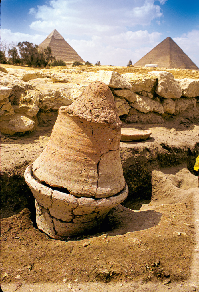 Una panadería en Gizeh. Una de las primeras cosas que descubrió Lehner en la Ciudad Perdida fue una panadería. En la imagen, recipiente para cocer el pan. Su parte inferior descansa en un hoyo donde se disponía leña a la que se prendía fuego para cocer el pan. ©2023 by Ancient Egypt Research Associates. Image by Mark Lehner