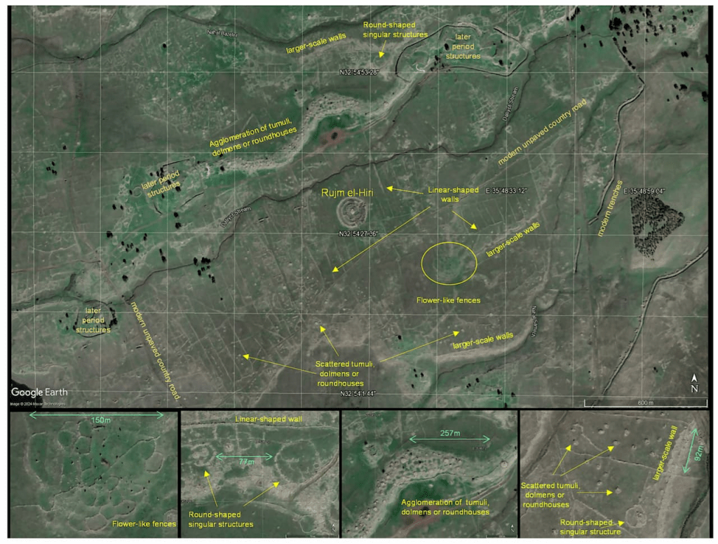 Paisaje alrededor del yacimiento de Rujm el-Hiri, vista a gran escala. Panel superior: vista general de la zona de Rujm el-Hiri con distintos tipos de objetos arqueológicos señalados con flechas. Paneles inferiores: ejemplos de los principales tipos de objetos arqueológicos identificados en las imágenes de satélite. Crédito: O. Khabarova et al.