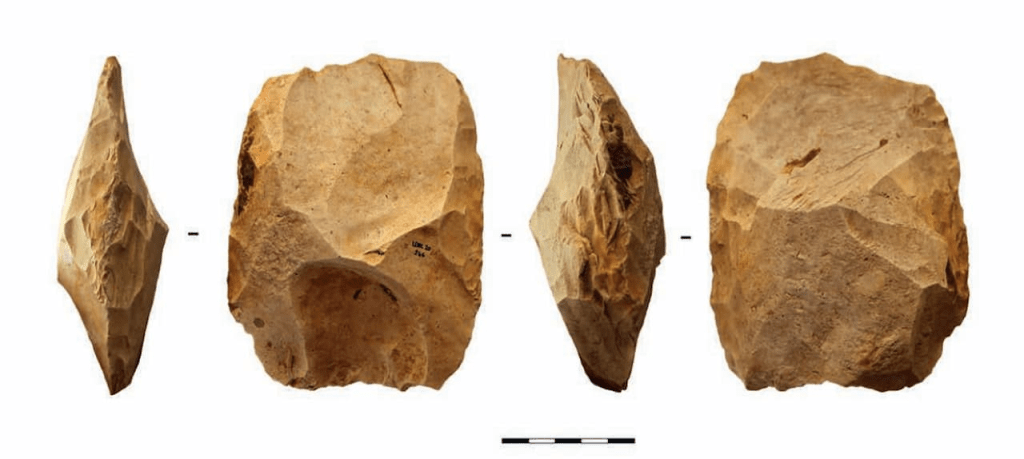 Bifaz reciclado como núcleo. Los filos laterales iniciales aún están presentes; tras el modelado, la pieza fue sometida a un corte bipolar unifacial. Crédito: C. Mathias / Chartres Métropole