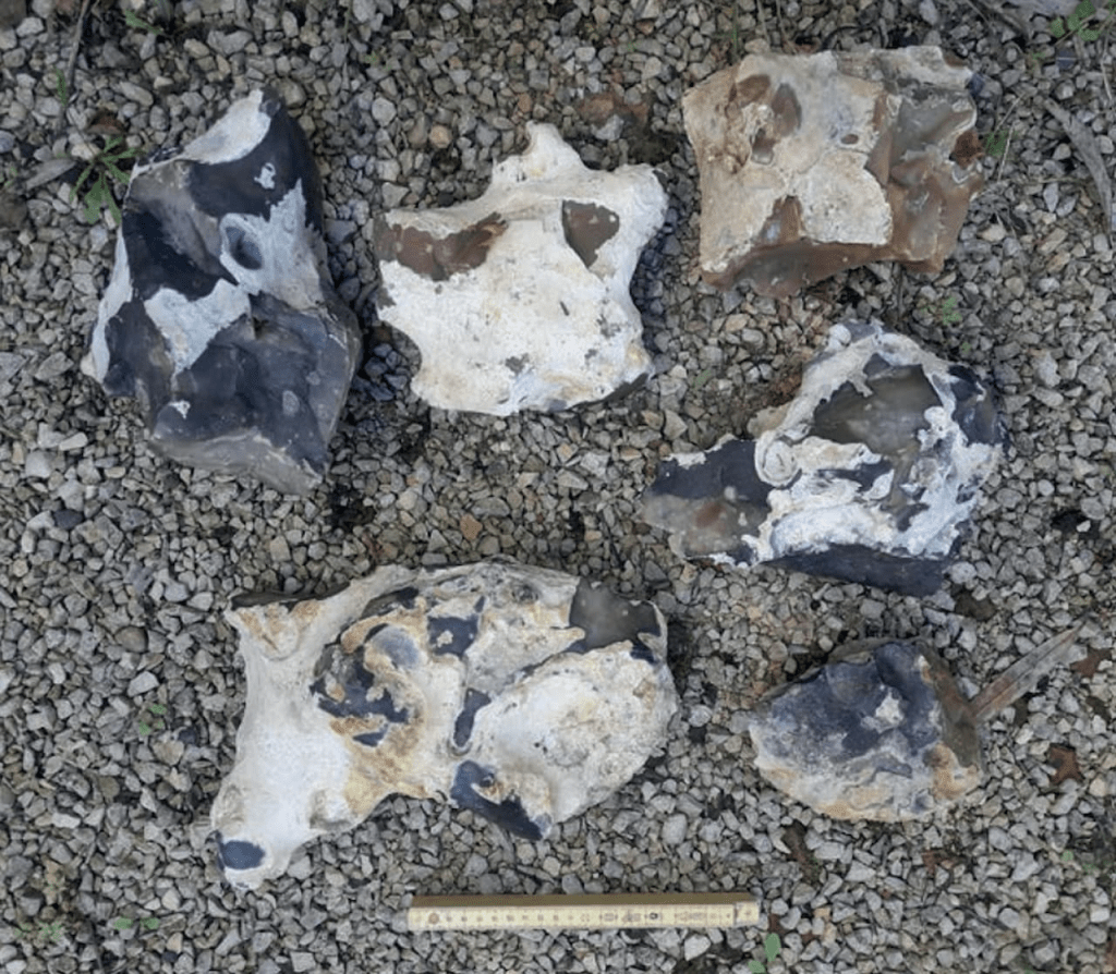 Bloques muy irregulares de sílex local, procedentes de las alteritas y/o de los bisaltos que recubren el lecho rocoso calcáreo de la meseta de Chartres. Crédito: M. Brenet / INRAP