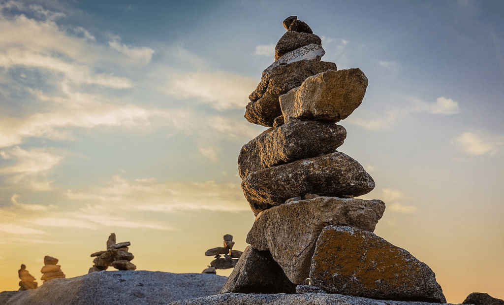 Los Cairns o montículos de piedras, túmulos compuestos de pequeñas piedras en forma cónica que se encuentran sobre todo en montañas o cerca de cursos de agua. Un ejemplo más elaborado son los Inuksuit de los Inuit.