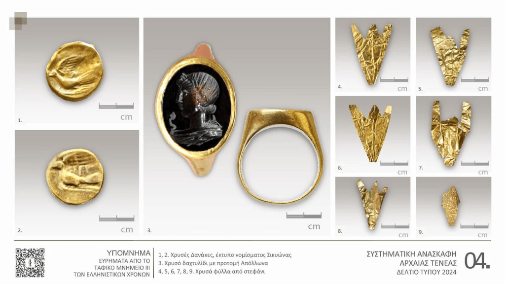 Entre ellos destacan un anillo de oro con un sello de piedra semipreciosa representando a Apolo con una serpiente curativa, dos monedas de oro que replican los tipos monetarios helenísticos de Sición, una ofrenda votiva en forma de dedo de terracota, fragmentos de una corona de oro, pequeños vasos cerámicos de época helenística, un tetróbolo de plata de Filipo III Arrideo, instrumentos de hierro como estiletes y cuchillos, adornos de bronce, cuentas de vidrio y recipientes de perfume de diversas formas.