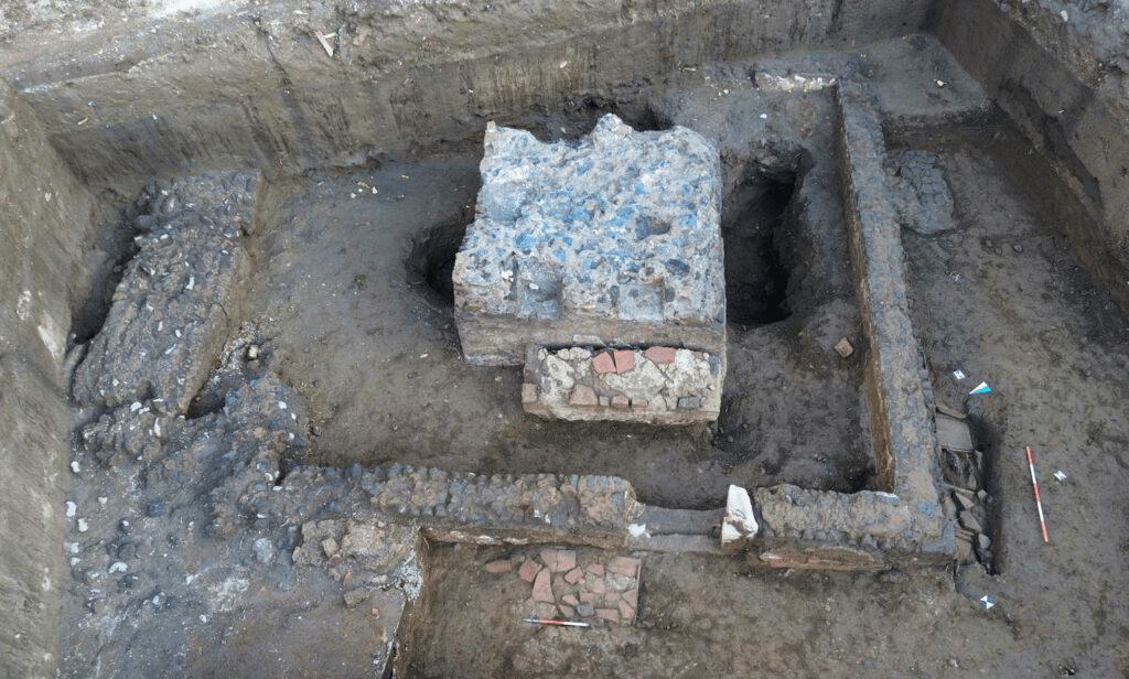 Un elemento arquitectónico especialmente relevante dentro de la excavación es un mausoleo de planta cuadrangular construido con la técnica de opus reticulatum, empleando bloques de toba gris. Con una estructura de tres metros por lado, presenta nichos enlucidos en sus muros internos, diseñados para albergar urnas cinerarias, lo que sugiere un uso prolongado de la necrópolis a lo largo de varias generaciones.