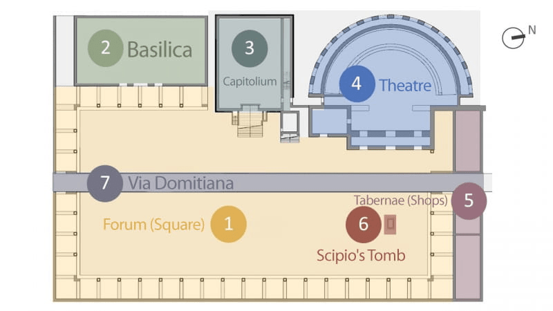 Esos restos, en bastante mal estado, incluyen foro (rectangular, se supone que bajo el pavimento reposa Escipión), capitolio (del siglo II d.C. y con un templo dedicado a la tríada Júpiter, Juno y Minerva), basílica (de tiempos de Sila), teatro (de época Antonina, con aforo para un millar de espectadores), murallas, cisterna, termas, anfiteatro, necrópolis (del período imperial) y un ara que se colocó en el sitio donde se supone que está inhumado el general romano, en el foro, frente a las tabernae (tiendas).