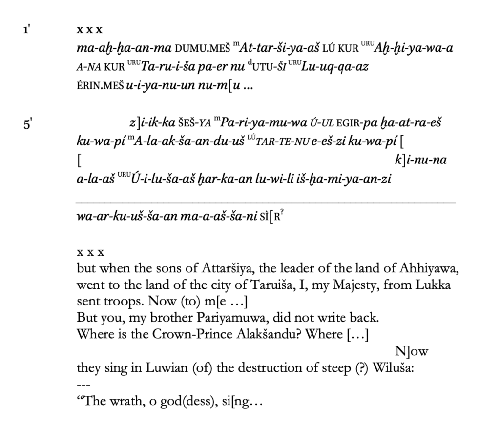 La tablilla describe una correspondencia real entre un gobernante hitita y Pariyamuwa, un rey o vasallo regional, probablemente de Taruiša (Troya). Se refiere a Ahhiyawa, un personaje conocido por los registros hititas, que atacó a Attarshiya y sus hijos en Taruiša. Esta narración es coherente con relatos anteriores en los que se representa a Attarquia como un formidable líder aqueo en Anatolia occidental.