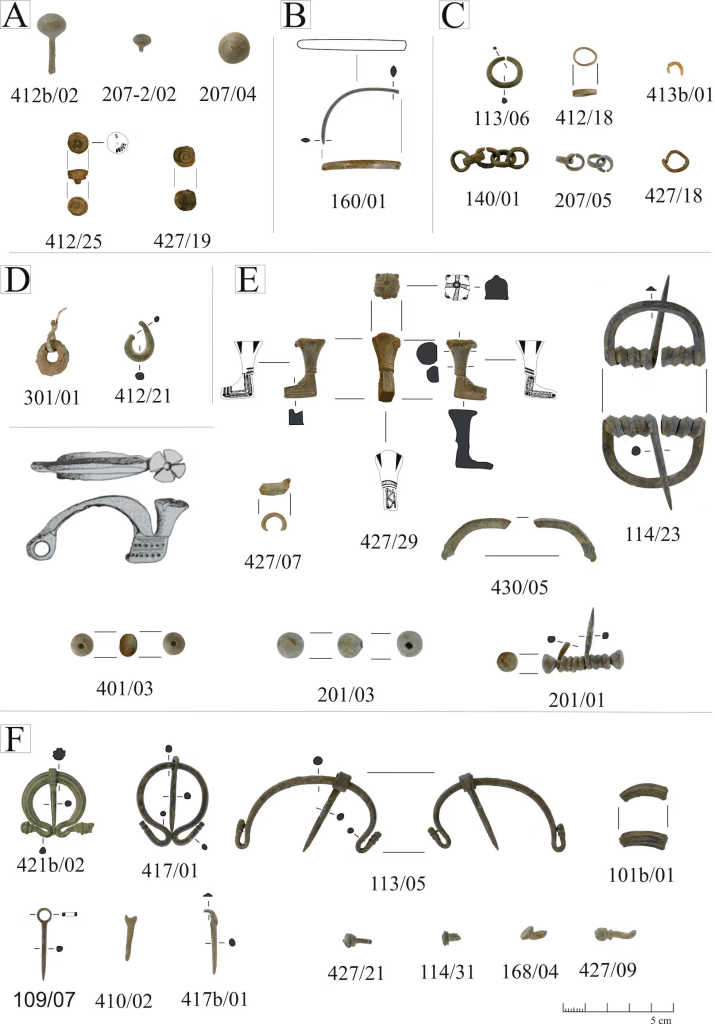 Además de fibulas y cinturones de producción local, se han localizado elementos exógenos, de fuera de la población, como cuentas de talco y vidrio para elaborar collares, lo que demuestra transacciones con las poblaciones de la Meseta.