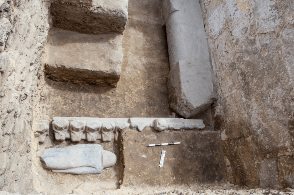 Al norte del umbral, se halló un conjunto de 13 estatuas de granito rosa sentadas en un banco alto, un descubrimiento sin precedentes en Saqqara. Entre ellas, figuras de las esposas del príncipe —algunas sin cabeza— y una estatuilla negra de 1,35 metros colocada boca abajo.