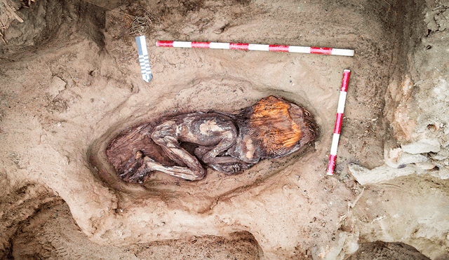 Lo que hace único este hallazgo es la preservación de piel, cabello y uñas, condiciones que rara vez se encuentran en contextos arqueológicos de la región. El cuerpo fue cuidadosamente envuelto en tejidos de algodón, esterillas de junco y un llamativo panel recamado con plumas de guacamayo, dispuestas sobre una red de fibras vegetales. Sobre su cabeza se colocó un tocado elaborado con fibras entrelazadas, lo que refuerza la idea de su alto estatus social.