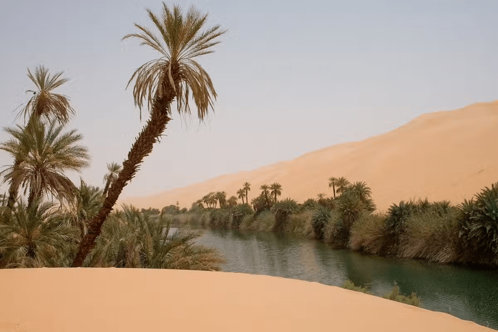 Un lago en el oasis de Ubari (sudoeste de Libia), con plantas nativas y palmeras datileras. Wikimedia Commons., CC BY