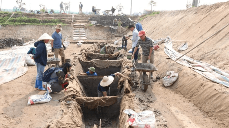 El descubrimiento inicial se produjo en diciembre de 2024 cuando un residente local, Nguyen Van Chien, se encontraba restaurando un estanque y encontró los bordes de las embarcaciones enterradas. Reconociendo su potencial importancia, se notificó de inmediato a las autoridades, lo que dio lugar a una excavación de emergencia realizada por el Departamento de Cultura, Deportes y Turismo, en colaboración con el Instituto de Arqueología de la Academia de Ciencias Sociales de Vietnam, en marzo de 2025.